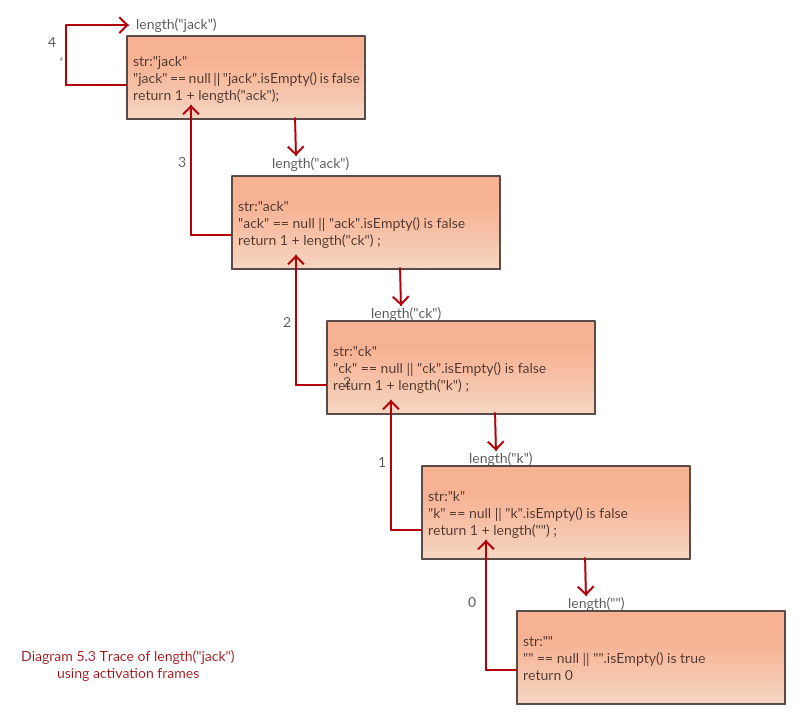 We can visualise the activation-frames using the above diagram too. Here we are drawing the activation frames from the top of the page down. For example, the activation frame at the top, which would actually be at the bottom of the run-time stack, represents the first call to the recursive method. The downward-pointing arrows connect each statement that calls a method with the frame for that particular execution of that method. The upward pointing arrows show the return point from each lower-level call with the value returned alongside the arrow. For each frame, the return point is to the addition operator in the statement return 1 + length(...)